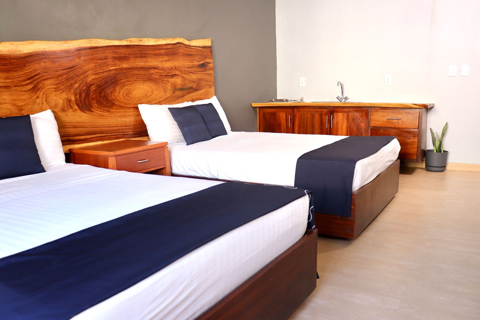 Con un diseño sencillo pero resaltando el arte objeto que emblemátiza las cabeceras de madera con sus betas y esencias naturales. Es un espacio con todo lo escénicas para un día.